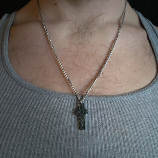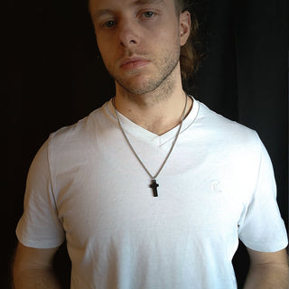 Black Cross Stainless Steel Pendant on Male's Neck with White Shirt
