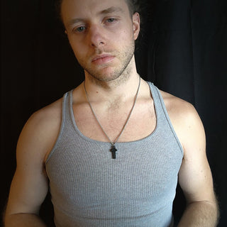 Black Cross Stainless Steel Pendant on Male's Neck with with Gray Tanktop
