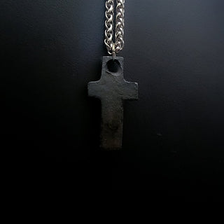 Black Cross Stainless Steel Pendant Against Gray Shirt