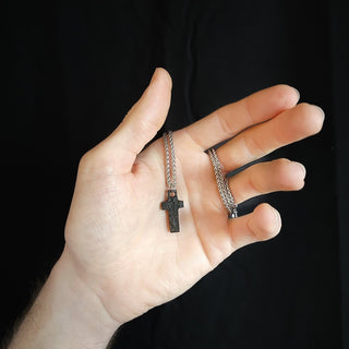 Black Cross Stainless Steel Pendant Against Palm